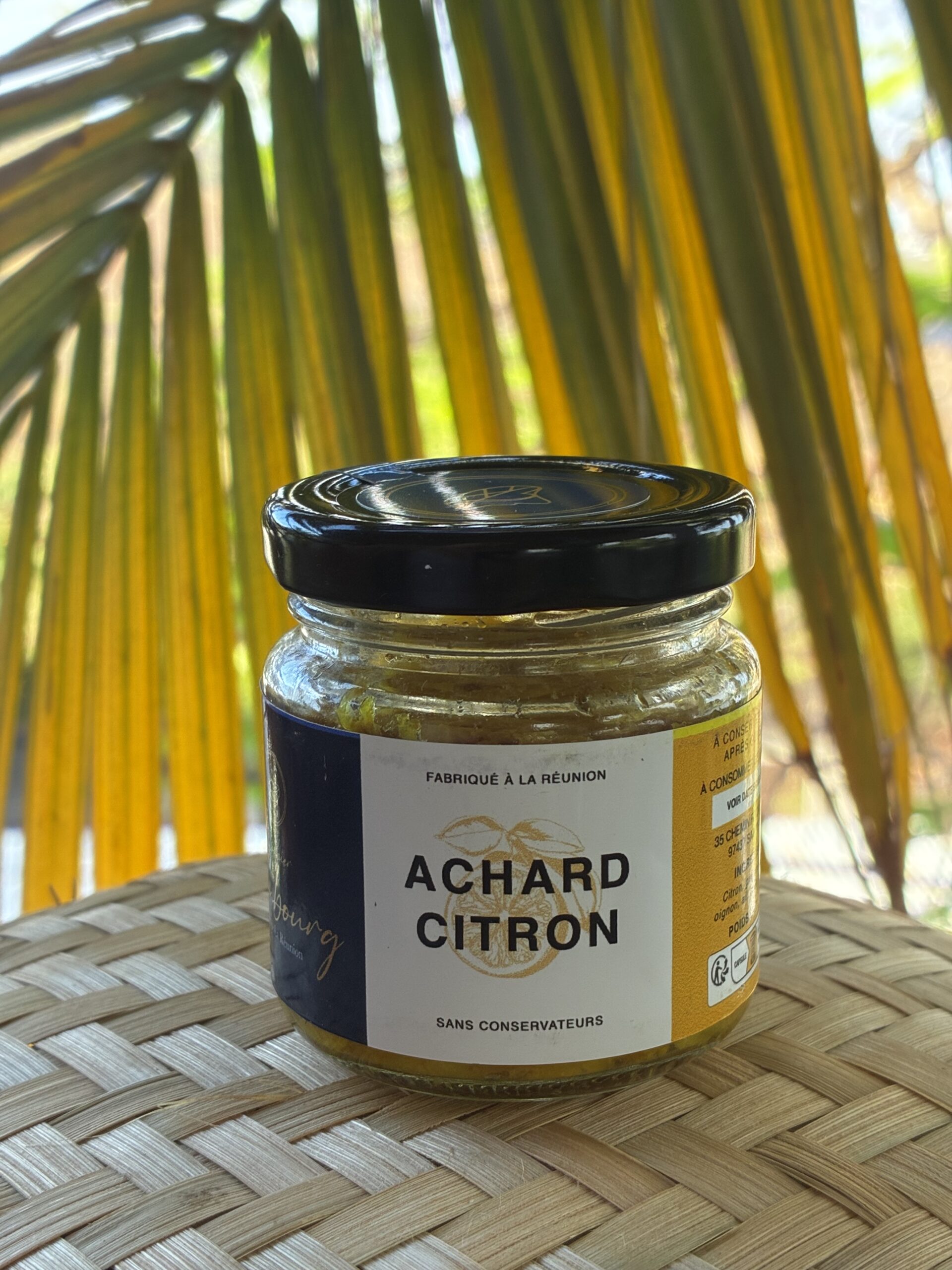 | Description | Un zeste de caractère pour réveiller tous vos plats ! Entre piquant, acidulé et parfum d’agrumes, cet achard artisanal apporte la touche créole qui fait toute la différence. | Préparé avec des citrons frais gorgés de soleil, l'Achard Citron est un condiment acidulé et épicé qui relèvera vos plats d'une touche de fraîcheur. Idéal pour accompagner viandes, poissons ou riz, il s'intégrera parfaitement dans votre cuisine quotidienne. | L'Achard Baba Figue est une spécialité réunionnaise, où le baba figue est finement émincé et mariné dans un mélange d'épices locales. Ce condiment croquant et légèrement piquant est parfait pour accompagner vos plats créoles et ajouter une touche d'exotisme à vos repas. | L'Achard Palmiste est une préparation raffinée à base du cœur tendre du palmiste, mariné dans des épices. Ce mets délicat, emblématique de la Réunion, apporte une texture douce et une saveur subtile à vos plats, pour un accompagnement authentique et savoureux. | Un achard péi à base de chou coco, préparé à la main avec des épices locales. Croquant, relevé et 100% artisanal, parfait pour accompagner vos plats créoles. | Croquant, relevé et plein de saveurs locales ! Ce mélange unique de chou de coco et d’épices réunionnaises apporte une touche exotique et ensoleillés à vos caris, riz, sandwichs ou grillades. | ||||||||||||