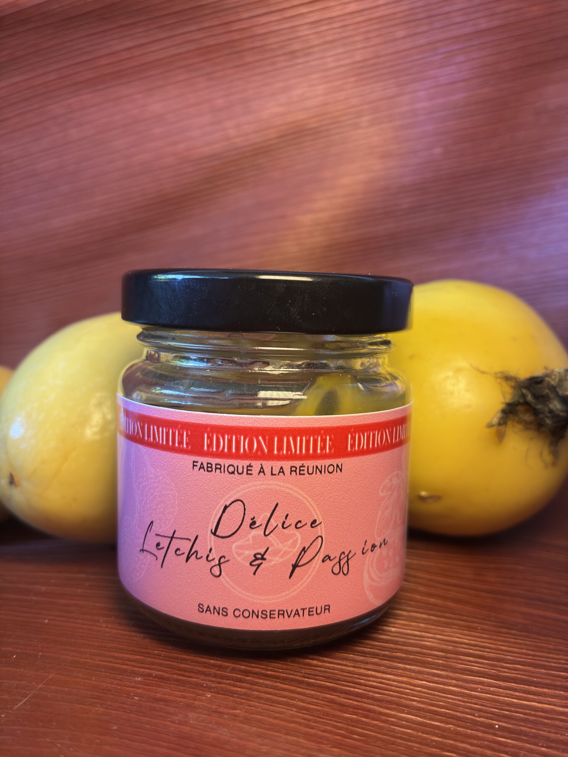 Composition : letchis, fruits de la passion, sucre, jus de citron et gélifiant